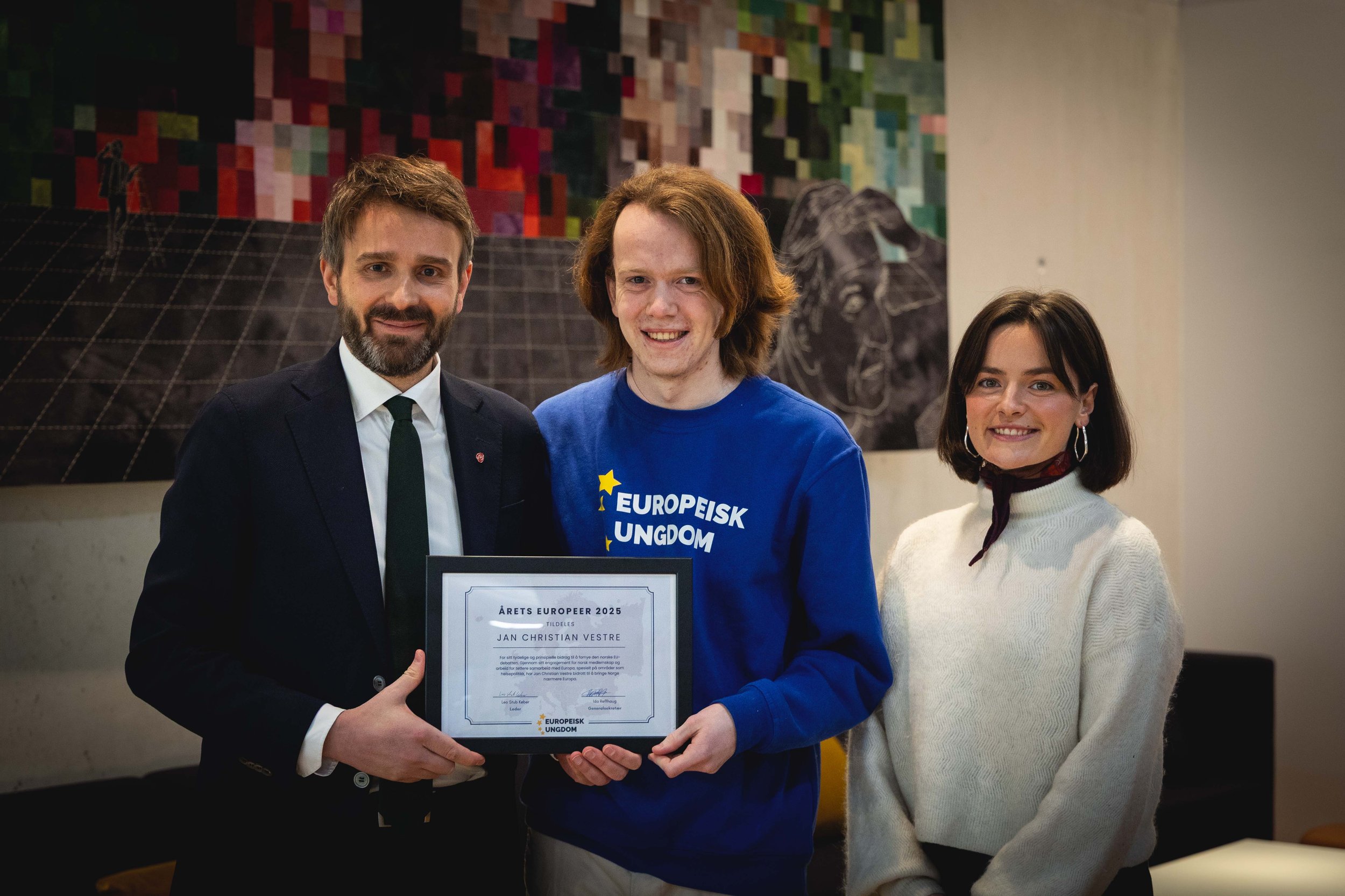 Helse- og omsorgsminister Jan Christian Vestre fikk prisen “Årets europeer” av Europeisk Ungdom i 2025. Nylig fikk vi muligheten til å møte ham og overrekke prisen, med Aftenposten tilstede. Hele saken kan leses her. (bak betalingsmur)